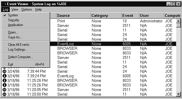 The first key concept to grasp with the Event Viewer is that this one interface displays all three types of Windows NT audit records: system events, security events, and application events. You select which of these event types is displayed using the Log menu (see Figure 24.4). The Event Viewer remembers the type of log you were looking at the last time you used this utility and displays this same log type when you next start it. To determine which log is displayed at any given time, you simply look at the title. The title contains two useful bits of information. First is the type of auditing performed. The other is the machine whose audit log is being displayed. Once of the nice features for administrators who are in charge of multiple systems is the ability to select various Windows NT computers for which you want to display the audit log. Of course, you have to have the appropriate trust relationships established with these machines, but it is worth it if you have several systems to keep track of.