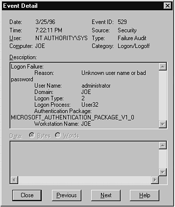 This dialog echoes the information contained on the summary display, along with several other useful bits of information. The exact details depend somewhat on the event encountered. For example, in Figure 24.5 where I intentionally typed in a bad password, you can see a text description of the reason and even the logon authentication package used. Some events display data in the bottom text area that can give you clues as to the state and activities that were occurring to cause the event. I always like to screen-print messages that I might have to take action on (or copy them down if screen printing is too much of a problem).