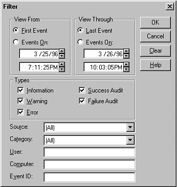 One thing I considered a bit strange about the Event Viewer display was the fact that they did not allow you to sort on any of the categories in the multicolumn listbox display by simply clicking the column heading (such as Category). You can find this type of control on the My Computer utility on your desktop. This would make it really easy to sort the list by user, for example, and see who is being naughty and nice. You do have some of this functionality by using the Filter option on the View menu. This gives you a dialog (see Figure 24.7) that enables you to focus on a particular category, user, and so forth. You have to be somewhat careful because you don't see events that don't match your input criteria but might be important to you (use the Clear button on the Filter dialog to view all events). This is an interesting technique to keep in your inventory when you have to audit a large number of events.