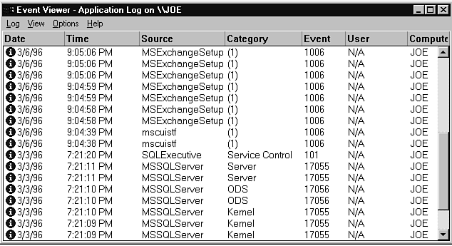 The final log is the application log, shown in Figure 24.8. This is perhaps the least-exploited log in its basic form. About the only applications I have loaded that make good use of this log are the Microsoft BackOffice applications, and even they could make greater use of it. I like the concept of being able to record application events in one central point as opposed to dozens of different log files scattered all over the system (I have had to deal with these files before, and they can be a bit of a pain). The software development kits from Microsoft enable programmers to interface to these audit files. You might want to consider this if you have any input into the application development at your facility.