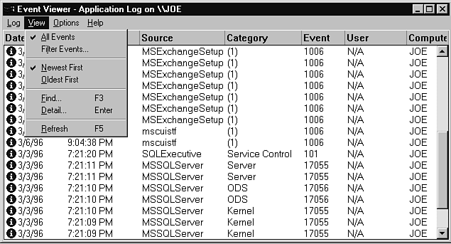 One final set of controls you have in the Event Viewer tool is shown in Figure 24.10. I have already covered the All Events and Filter Events options. This menu also gives you the option of displaying the events from earliest to latest or latest to earliest event. The Find dialog looks similar to the Filter dialog, but instead of limiting what is displayed, it takes you to the records that meet your input criteria. The Detail option is similar to double-clicking a particular event. Finally, Refresh updates the display with any new events.