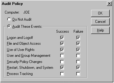 The Audit option displays the Audit Policy dialog shown in Figure 24.12. The radio buttons are important because they make the basic selection as to whether you perform any of these detailed security auditing functions. If you select to perform these security auditing actions, you are given two basic choices for auditing. The first column of checkboxes enables you to audit when users perform the functions listed successfully (such as logging on with the correct user ID and password). The second column of checkboxes enables you to audit when users fail when trying to perform a function. You can greatly reduce the number of events recorded if you look only for failures. This catches hackers or people trying to access a resource for which they lack permission. However, if you are trying to gather statistics on usage or logging all (legal) access to a resource, you would want to use the first column's checkboxes. Of course, if you want a lot of information, you can audit both successes and failures.