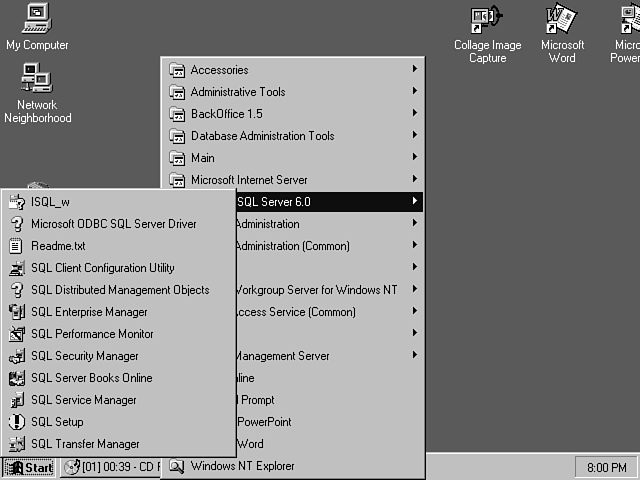 Next, I would like to provide an overview of how SQL Server is implemented on your NT Server machine. The utilities that you will commonly use are arranged on the SQL Server program group on the start menu as shown in Figure 26.2. As you can see, there are a number of utilities designed to help you work with the SQL Server system. For purposes of this chapter, I will focus on three of these utilities: