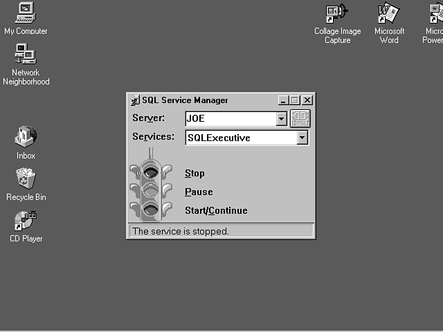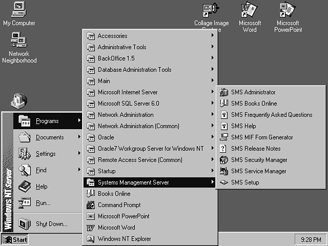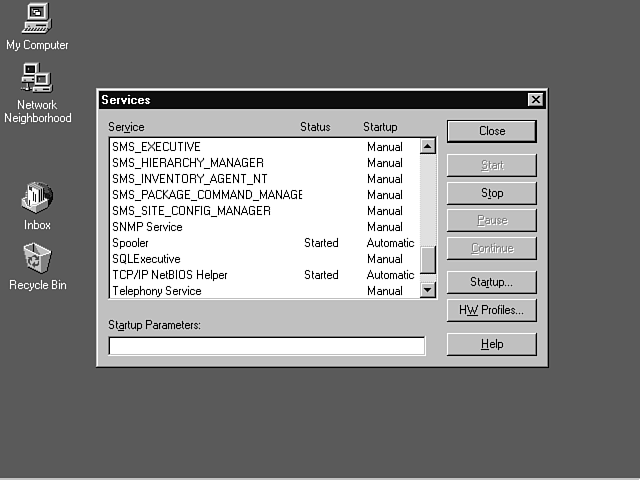 The SMS program group contains the tools that you would use to access these functions. Figure 26.17 shows this program group. In this abbreviated overview of SMS, there are three items in this program group that I wanted to bring to your attention. The first is the administrator, which is the main tool for controlling SMS. The second is the guides online option. I sense Microsoft is moving more to using this to distribute documentation. You may want to take some time to get comfortable with their online documentation and help systems before crisis strikes and you desperately need to get at critical information. The third thing that I wanted to point out is the service manager icon. Much like SQL Server and Exchange Server, SMS uses a series of background processes that are specialists in their respective areas that must be running to get access to these features. Figure 26.18 shows the background services associated with SMS.