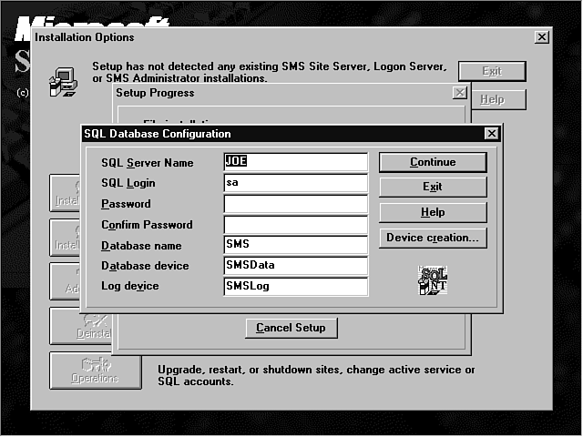 One final note that I just had to throw in here. Figure 26.20 shows the installation status panel from the SMS installation. You can see that it has multiple status indicators. Much like the winnt26.exe installation used for Windows NT itself, the installation procedure uses multiple threads running at the same time to accomplish the installation. In the SMS case, the file installation is going in parallel with database configuration work. I really like it anytime that people spend the time to make installation scripts an efficient use of the installers time and not just an afterthought done the day before the product goes to the production group.