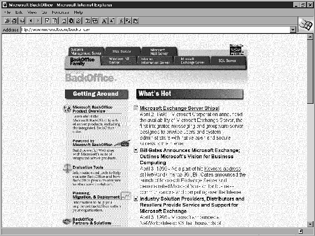 A couple of things might be of interest to you. The first would be the Microsoft Web page (http://www.microsoft.com). Figure 26.25 shows the BackOffice page that is accessible from the main Microsoft page. Yes, Microsoft has even found a way to implement tab dialogs on a Web page. You can see a lot of text and also a number of underlined sections of text and also some buttons (like the tabs at the top of the page) that you can click to go exploring. This is a good experience, and you will quickly learn to move around on these pages. Let me go over a brief list of some of the resources that can be found on this Web site:
