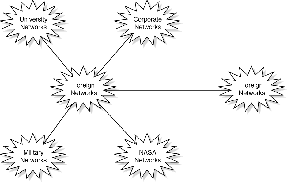 So what is the Internet? The easy answer is a series of connected networks that use the TCP/IP protocol to transmit information around the globe. Figure 28.1 illustrates the process of the Internet. This structure, although correct, gives little information about the Internet and what it can do for you. It does bring out a few key points. First, the Internet shares a common transmission protocol (TCP/IP, which is described in more detail in Chapter 7). It is also a series of networks located in most of the countries in the world that have been connected together to enable users to share information. It is amazing to me the number of academic, government, corporate, and even private computer systems that give up part of their computing capacity, disk storage space, and computer staff time to provide free resources to "strangers" out there on the Internet. I understand the commercial undertakings in which companies provide product support or conduct marketing, but the idea of giving up resources to other users is what impresses me most about the Internet culture.
