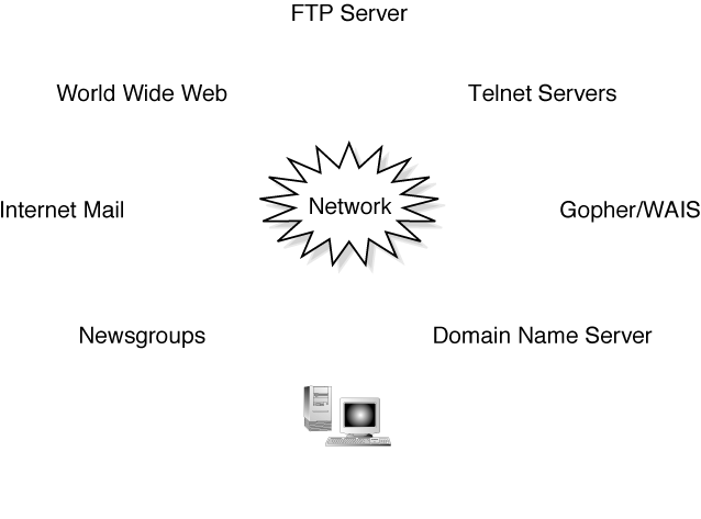 In a sense, this leads to a second view of the Internet. This logical view enables you to ignore the details of the wiring (leave that up to the network professionals) and to instead look at the Internet as a series of services you have access to after you are connected to it (see Figure 28.2). In the near future, you might see Java applications added to this list. The Java standard has started to come into use in the last several months as a way to distribute mini-applications over the Internet to be run by local Java interpreters. Some say it will replace operating systems, PCs, and everything but the Internet itself and simple display devices. We'll see. The Internet can be thought of as an evolving life formwe're just not sure what it is evolving into.