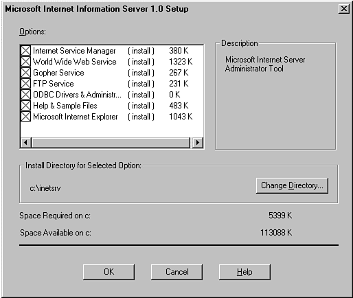 Four key screens appear in the setup process for IIS that you need to think about before you start the process. Of course, you need to wade through the license agreement and the screens that ask whether you want to continue. Figure 28.3 shows the first key screen. Your key decision here is which components you want to install. I generally recommend the Internet Service Manager, World Wide Web Service, FTP Service, and Microsoft Internet Explorer options on all installations (hey, the Web is hot). I recommend that you install Gopher only if you have a number of users who would rely on this service. You probably should install the ODBC access only if you plan to derive portions of the Web page content from the database or store some of the responses from your Internet server in your database. Help & Sample Files is a nice option if you have the space (it offers you some good designs for Web pages in case you do not think artistically and therefore would create technically correct but boring Web pages). Your job is to discuss with your users which options they want before starting the installation process.