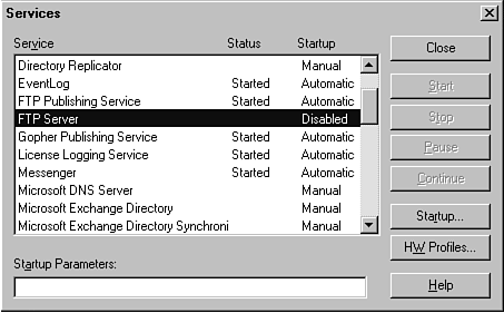Figure 28.6 shows the configuration of services you should expect to see after installing the IIS FTP service. Your default NT FTP server will be disabled. The FTP Publishing Service is the one associated with IIS. It will be set for automatic startup and should be running. You could go into your Registry and delete the old FTP server, but I don't recommend that you do this unless necessary.
