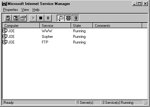 The Internet Service Manager interface is typical of what you see in a number of the new Windows NT utilitiessimple, with heavy use of button bars and property pages. Figure 28.9 shows this utility. The Internet services you installed are displayed, along with their status (normally, Running). In Figure 28.9, you can see that I have installed the World Wide Web (WWW) service, Gopher, and FTP services. To take action on any of these services, you need to highlight the service you want and then click one of the items on the button bar or right-click the mouse and select properties to change the settings for the service.
