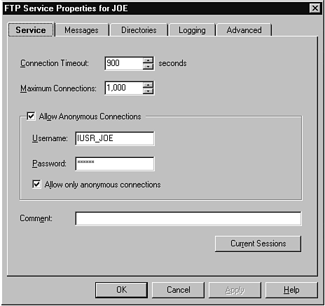 The finer set of controls comes from the property pages for the Internet services. You will see five property page tabs for the FTP server and four for the other ones. Figure 28.10 shows the first tab, which is the Service tab. You use this tab to control the time-out setting (when something takes too long, the system gives up) and the number of connections supported. It also enables you to allow anonymous connections (an Internet standard in which anyone can get in without knowing the password). Finally, for the FTP server, it enables you to take a look at the current sessions in progress.