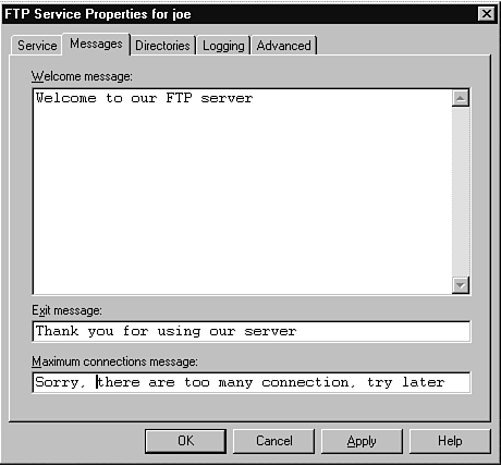 The Messages tab is available (and displayed) only for the FTP server (see Figure 28.11). You use this tab to enter text for messages that will be displayed to people who connect to your FTP site. The first message (Welcome) is displayed when a user logs in. The next message is displayed when the user exits from your site. The final message is displayed to users who are rejected in their connection attempts because the limit for the number of connections set up on the Service tab has been reached (you must be a very popular site with excellent content to run into this problem).