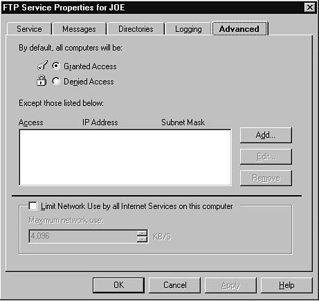 The final property tab in the Service Manager is the Advanced tab (see Figure 28.14). Actually, I would have called it the Internet Security tab or something similar. You use this tab to limit access to only a certain group of computers. You must become familiar with Internet addresses and subnet masks (123.123.0.0 with a subnet mask of 255.255.0.0 limits access to all computers in the 123.123.x.x group, for example). You also use this tab to limit the number of Internet sessions (from all Internet services) to a specified number. This prevents the Internet users from weighing down the system to the point where local users are unable to get adequate response time.