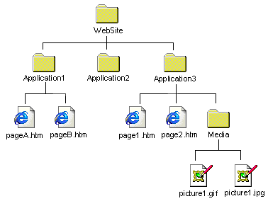 The reason for this up and down traversing of directories is because linked pages or images are referenced relative to the page containing the link. For sake of argument, in the above illustration suppose that pageA.htm in directory Application1 contains an <img/> tag pointing to picture1.gif in the Media subdirectory of directory Application 3. In order to make the src reference from pageA.htm to picture1.gif the following path is followed: