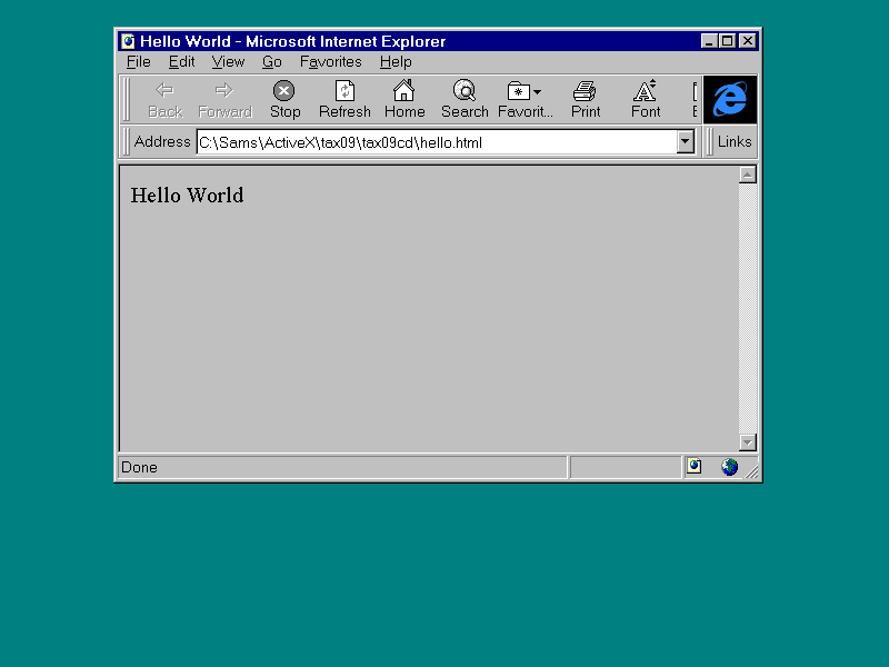 Reduce your Hello World page to just three lines using the <HTML> tag (see Listing