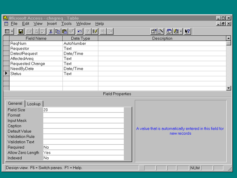 shown in Figure 9.7. Switch to the chngreq table and create the fields