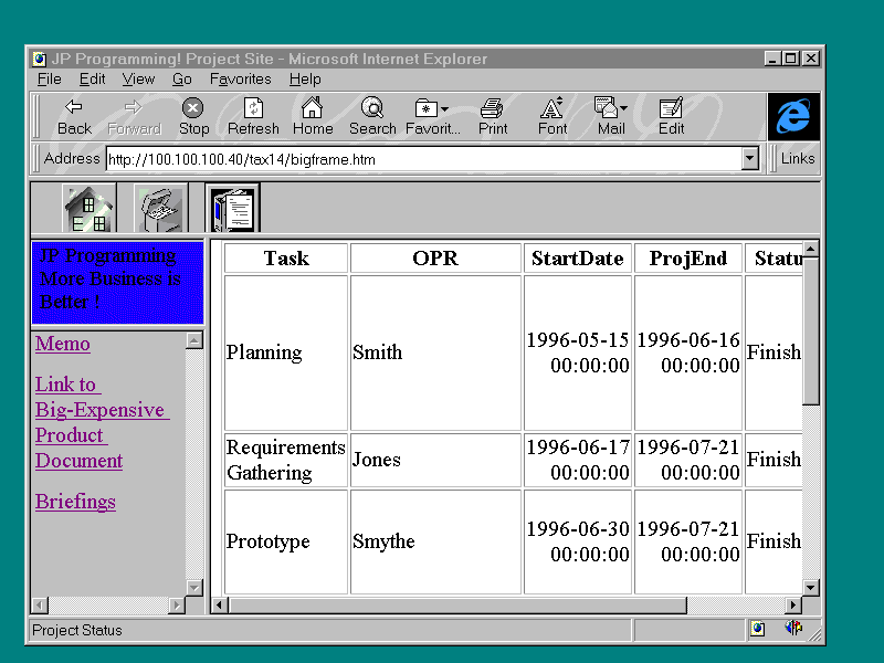 links to Frame4. See Listing 9.15 for details. Listing 9.15. Revised projstat.asp. Replace basic.asp with projstat.asp in bigframe.asp.