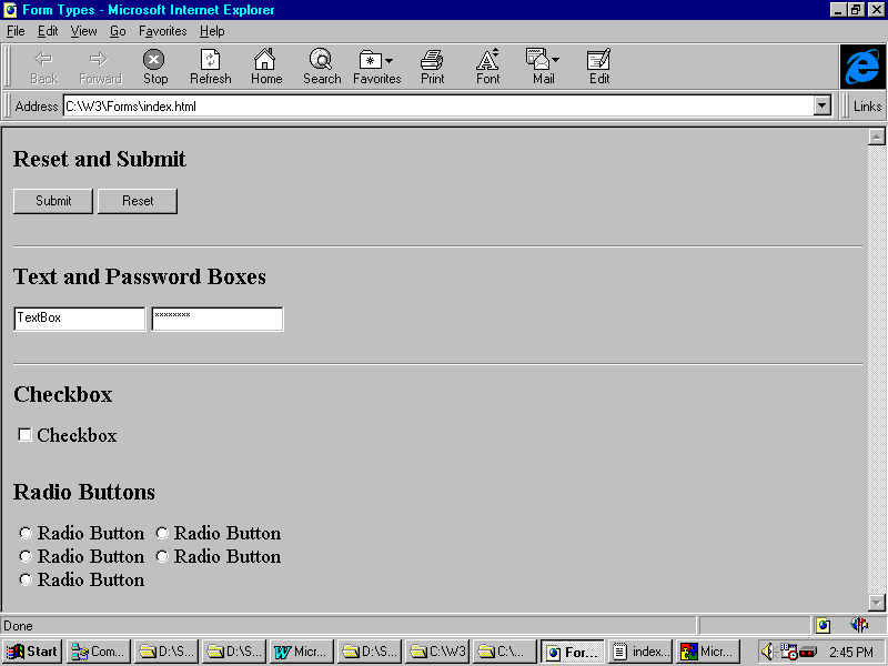 attributes of the <INPUT> tag. Several of these types can be seen in Figure 19.1. Figure 19.1. Several