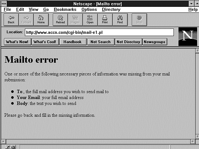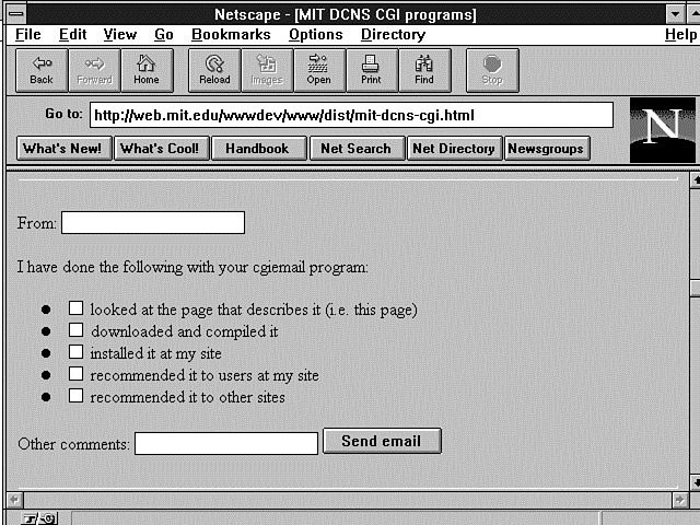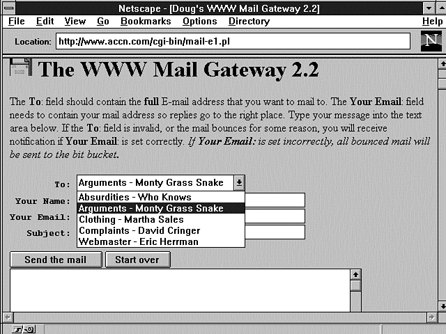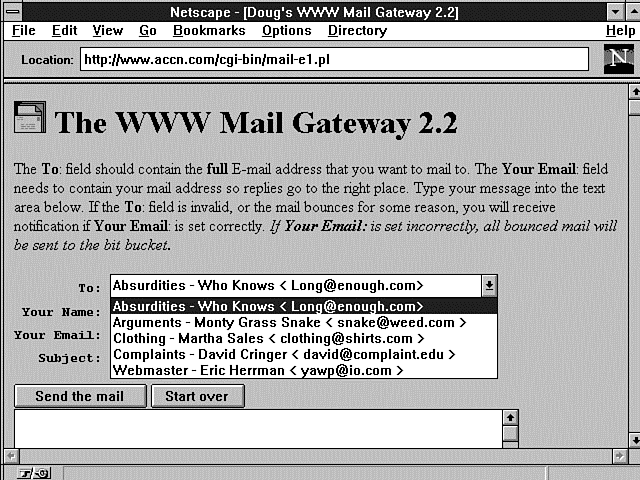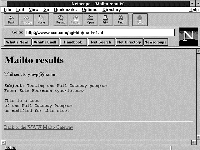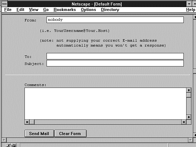 Also available is a .forward file and mail filter that handle returned mail from the WWW Mail Gateway. Put the .forward file in the home directory of the user who runs the HTTP daemon (do not put it in an active user's directory!!), and change the path name where mailto.handler.pl exists and is executable; all returned mail then is shipped off to the real sender. My server runs under the user www, whose home directory is /usr/local/www, as is evident from the source code. If your server runs as nobody, and you don't want to change that, you can make a home directory for nobody and enable mail to that user. If your server runs under your name, all returned mail is sent to your account unless you figure out how to redirect only WWW Gateway mail to the handler script. If the real sender's mail address is bad, the mail goes to the bit bucket.