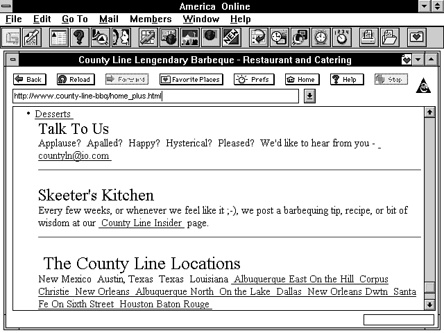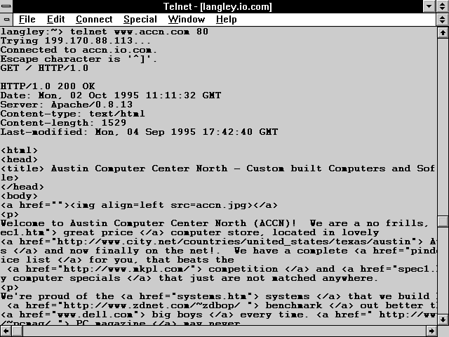 Take a look at the way I did this in Figure 2.2. First, I did a regular Telnet connection to my Internet provider. After I logged onto my provider's UNIX machine, I Telneted to one of the Web servers I'm responsible for. I did this from the command line by typing > telnet www.accn.com 80. The 80 also could be replaced with http. http is the name of the program or daemon that is assigned to listen for and interpret connections on port 80. The default port for HTTP's Internet connection is 80. Using 80 in this command always works. Using http usually works. Next, I just typed a valid Get method request header. I could have requested a CGI program. I even could have sent PATH_INFO and QUERY_STRING data. This is a great way to see what the server does with your request headers. You can send as many valid request headers as you want this way; just end the sequence of request headers with a blank line. The server will process the typed request headers just as if it had received them in the "normal" TCP/IP manner. As far as the server is concerned, it has received the request headers in a normal manner. It can't tell that these request headers were typed from the command line. Gook luck and have fun with this one. It's a great learning tool! | |