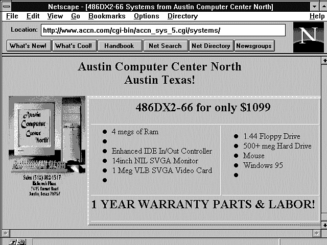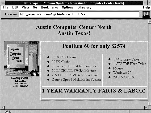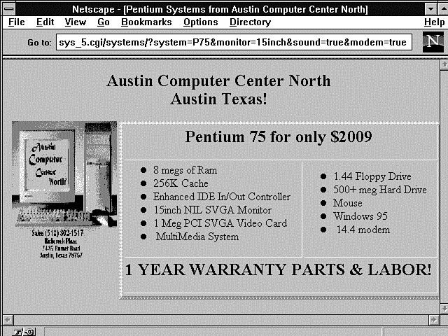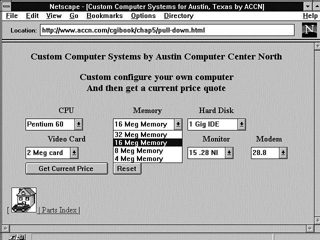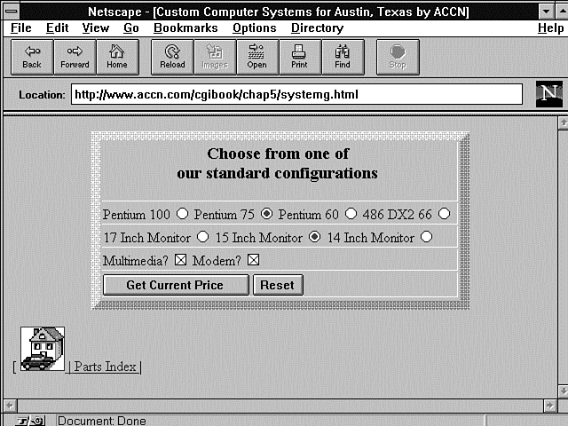 01: <html> 02: <head> 03: <title>Custom Computer Systems for Austin, Texas by AccN </title> 04: </head> 05: <body> 06: <center> 07: <form method="post" action="cgi-bin/accn_sys.cgi/systems/"> 08: <table border=10> 09: <th> <h3> Choose from one of <br>our standard configurations </h3> 10: <tr> <td> 11: Pentium 100 <input type="radio" name="system" value="P100" > 12: Pentium 75 <input type="radio" name="system" value="P75" checked > 13: Pentium 60 <input type="radio" name="system" value="P60" > 14: 486 DX2 66 <input type="radio" name="system" value="486d66" > 15: <tr> <td> 16: 17 Inch Monitor <input type="radio" name="monitor" value="17inch" > 17: 15 Inch Monitor <input type="radio" name="monitor" value="15inch" checked > 18: 14 Inch Monitor <input type="radio" name="monitor" value="14inch" > 19: <tr> <td> 20: Multimedia? <input type="checkbox" name="sound" value="true" checked> 21: Modem? <input type="checkbox" name="modem" value="true" checked> 22: <tr> <td> 23: <input type="submit" value="Get Current Price"> 24: <input type="reset"> 25: <tr> </table> </form> </center> 26: 27: <hr noshade> 28: [ <A HREF="http://www.accn.com"> 29: <img alt="Austin Computer Center " 30: src="home.gif" border=1 A> | 31: <A HREF="pindex.asp"> Parts Index </A> | 32: </body> 33: </html>