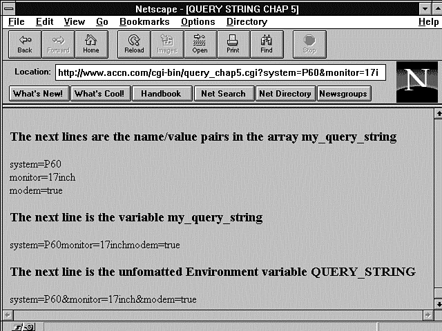 Obviously, just to begin to return the data in Figure 5.2, I had to be able to decode the incoming data. Using the Get method, the data is available for my CGI program in the environment variable QUERY_STRING.