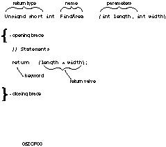 return_type function_name ( [type parameterName]...) { statements; }A function prototype tells the compiler the return type, name, and parameter list. Func-tions are not required to have parameters, and if they do, the prototype is not required to list their names, only their types. A prototype always ends with a semicolon (;). A function definition must agree in return type and parameter list with its prototype. It must provide names for all the parameters, and the body of the function definition must be surrounded by braces. All statements within the body of the function must be terminated with semicolons, but the function itself is not ended with a semicolon; it ends with a closing brace. If the function returns a value, it should end with a return statement, although return statements can legally appear anywhere in the body of the function. Every function has a return type. If one is not explicitly designated, the return type will be int. Be sure to give every function an explicit return type. If a function does not return a value, its return type will be void.
