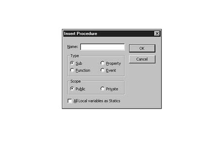 selected and then click OK. You now see the new Visual Basic procedure header and footer,