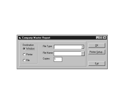 Company Master Report dialog box prompting you to set parameters for your print job. (See
