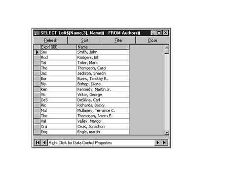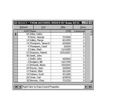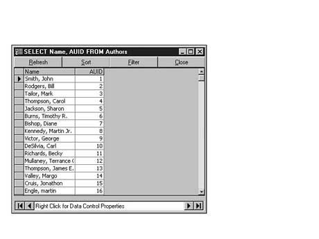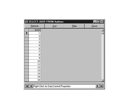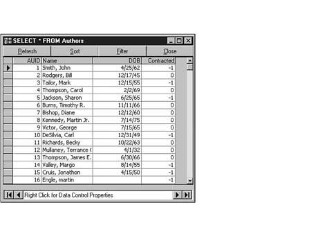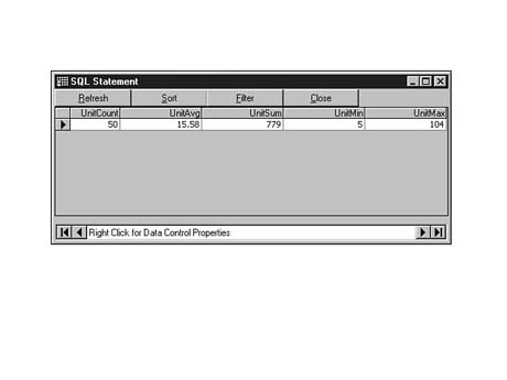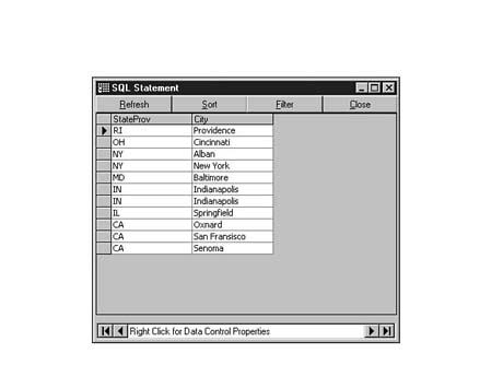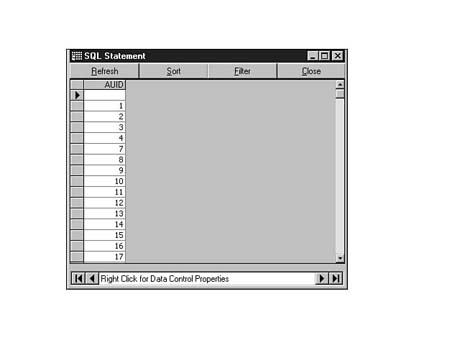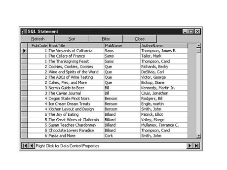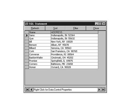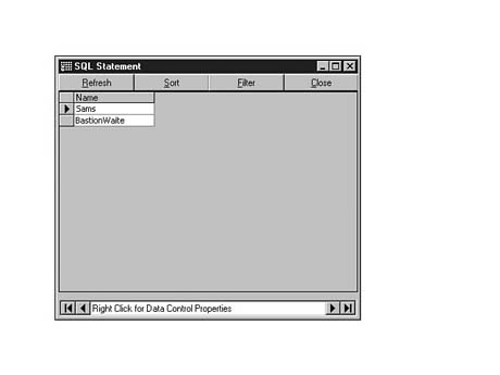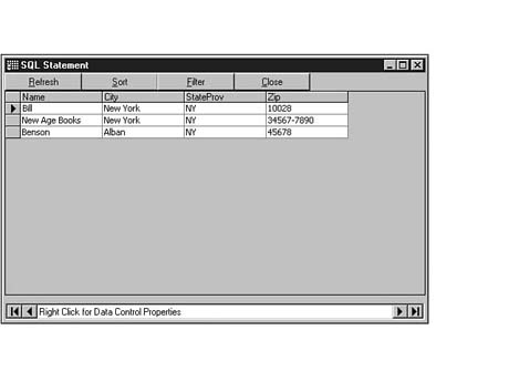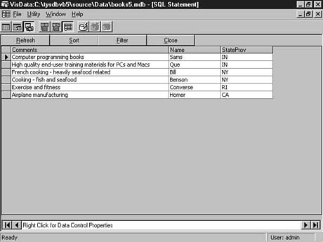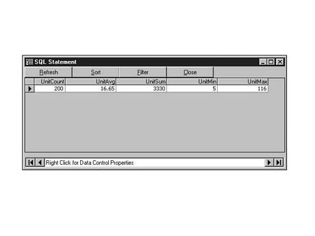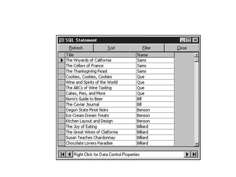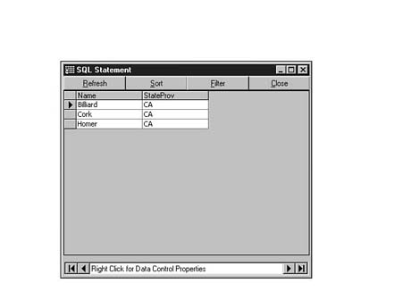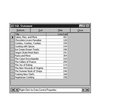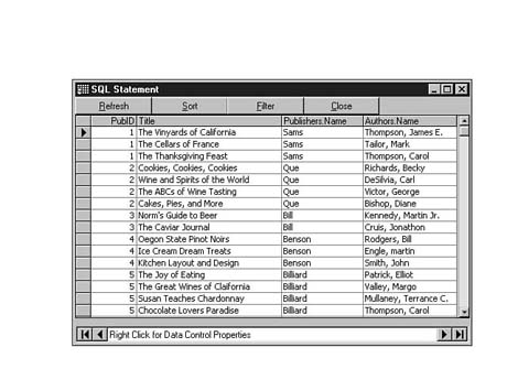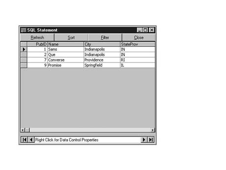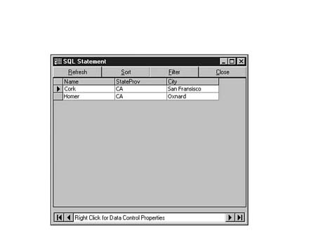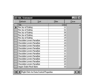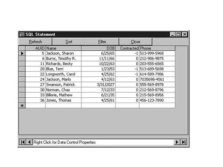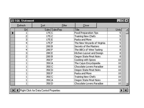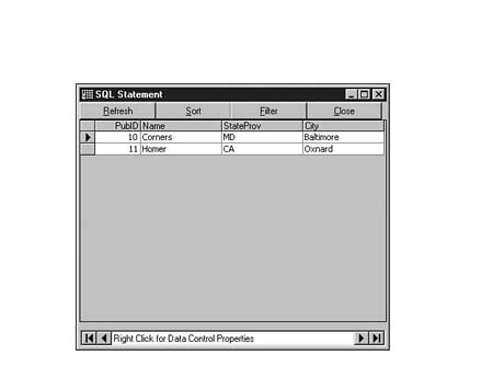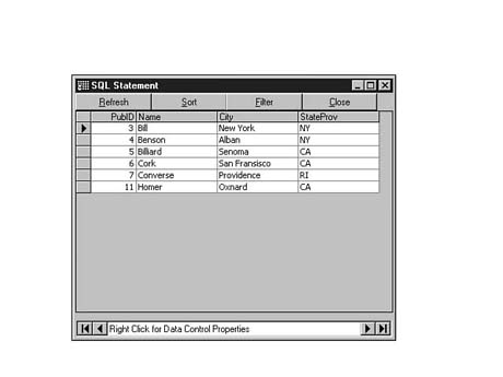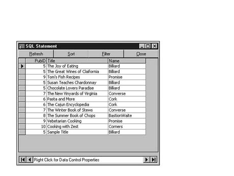 To do this, enter the following code into the SQL Statement window of Visdata. Execute your statement. The result set should look similar to Figure 8.35.
