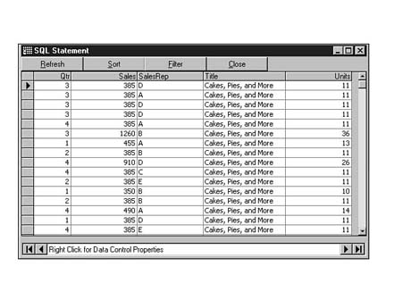 Notice, in Figure 8.34, that you can see a column with the header <>. When Microsoft Access Jet ran the SQL statement, it discovered some records that had no value in the guideSales.SaleRep column. SQL automatically created a new column (<>) to hold these records and make sure they were not left out of the result set.