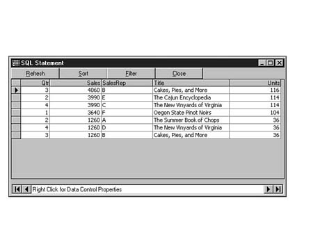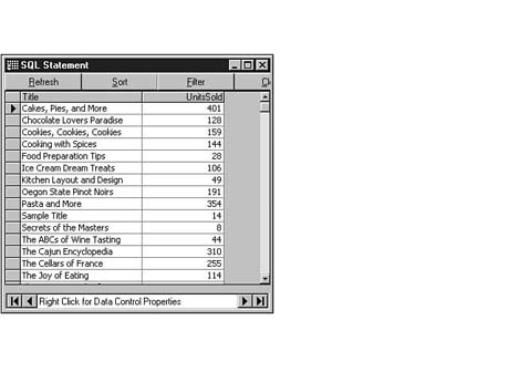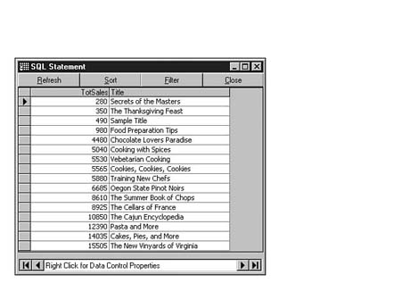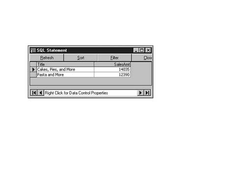 The columns used in the HAVING clause do not have to be the same columns listed in the SELECT clause. The contents of the HAVING clause follow the same rules as those for the contents of the WHERE clause. You can use logical operators AND, OR, and NOT, and you can include VB-specific functions as part of the HAVING clause. The following SQL statement (see Figure 8.27) returns sales in dollars for all titles that have more than 100 units sold and whose titles have the letter a as the second letter in the title: