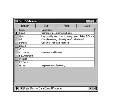 NOTE: PublisherComments was used as the name for the table used in the preceding example. When creating a Microsoft Access database, we could easily have named the table "Publisher Comments" (note the space), in which case, we would have had to enclose the table name in brackets in the preceding query, like so: