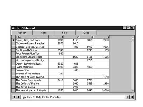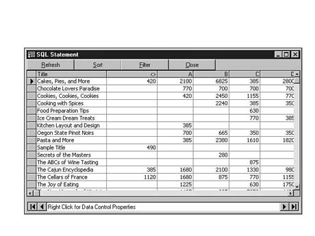 You can accomplish this with a complicated set of subsequent SQL statements that produces temporary views, merges them together, and so on. Thanks to the folks who invented the Microsoft Access Jet database engine, however, you can use the TRANSFORM_PIVOT statement instead. You can produce the entire result set in one SQL statement using TRANSFORM_PIVOT. The following SQL statement shows how this can be done. See Figure 8.33 for a sample result set.