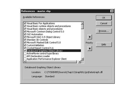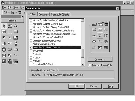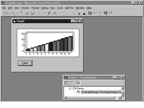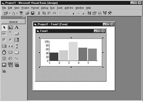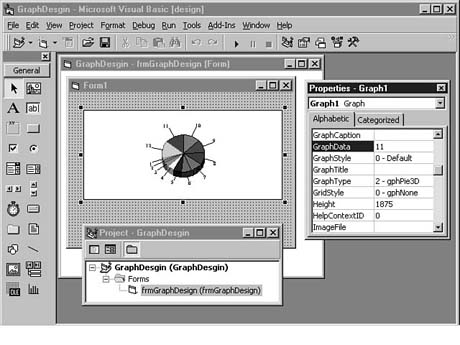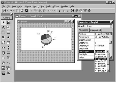 NOTE: It is important to keep in mind that you did not have to load the GRAPH32.OCX file into your project. Because this is part of the ActiveX DLL, you do not need to identify it in the Visual Basic project that uses the DLL. The OCX, and its supporting files, must be present on your machine, but you do not have to add it to your project.