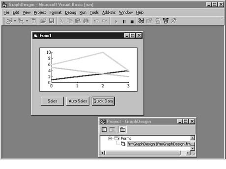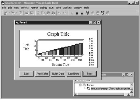 You need to add some code to this form. But first, save it (FRMGRAPH.FRM) and save the project (PRJDATAGRAPH.VBP). Then add the code in Listing 11.7 to the Form_Load event of the project. This sets the default size of the form to fill 75% of the screen.