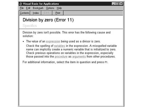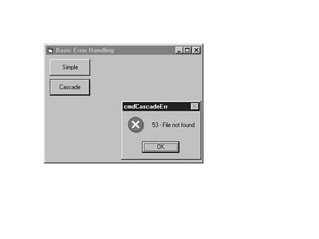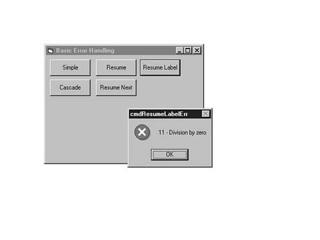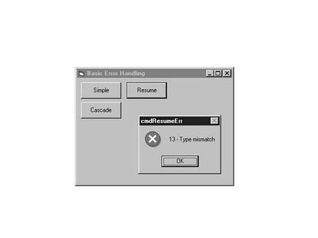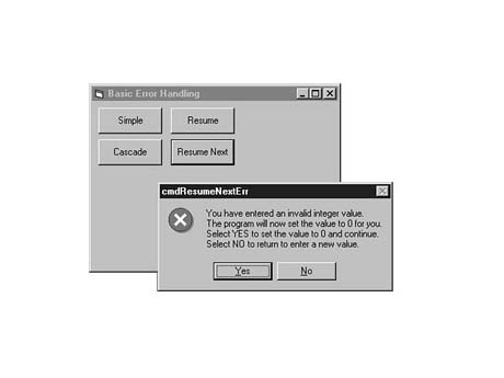 You also learned that you can declare a global error handler or a local error handler. The advantage of the global error handler is that it allows you to create a single module that handles all expected errors. The disadvantage is that, due to the way Visual Basic keeps track of running routines, you are not able to resume processing at the point the error occurs once you arrive at the global error handler. The advantage of the local error handler is that you are always able to use Resume, Resume Next, or Resume label to continue processing at the point the error occurs. The disadvantage of the local error handler is that you need to add error-handling code to every routine in your program.