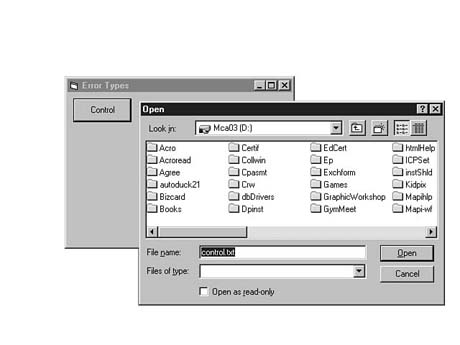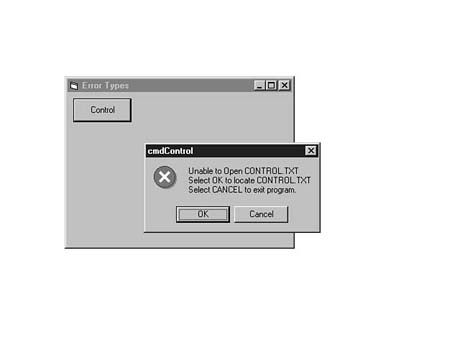 Each of these types of errors needs to be handled differently within your Visual Basic programs. You learn general rules for handling these errors in the following sections. General File ErrorsGeneral file errors occur because of invalid data file information such as a bad filename, data path, or device name. Usually the user can fix these errors, and the program can continue from the point of failure. The basic approach to handling general file errors is to create an error handler that reports the problem to the user and asks for additional information to complete or retry the operation. In Listing 14.9, the error handler is called when the program attempts to open a control file called CONTROL.TXT. The error handler then prompts the user for the proper file location and continues processing. Start a new Standard EXE project (ERRTYPES.VBP) and add a command button to the form. Set its Caption property to Control and its Name property to cmdControl. Also, add a CommonDialog control to the project. Enter the code in Listing 14.9 into the cmdControl_Click event. Listing 14.9. Adding code to the cmdControl_Click event.