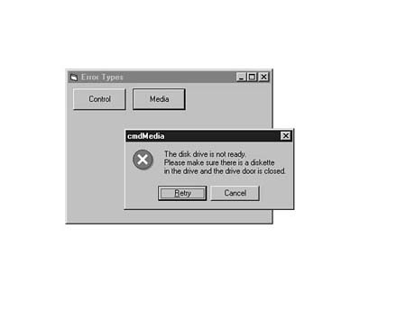Physical Media ErrorsAnother group of common errors is caused by problems with physical media. Unresponsive printers, disk drives that do not contain diskettes, and downed communications ports are the most common examples of physical media errors. These errors might, or might not, be easily fixed by your user. Usually, you can report the error, wait for the user to fix the problem, and then continue with the process. For example, if the printer is jammed with paper, all you need to do is report the error to the user, and then wait for the OK to continue. Let's add another button to the PRJERRTYPES.VBP project to display an example of physical media error handling. Add a new command button to the project. Set its Caption property to &Media and its Name property to cmdMedia. Enter the code in Listing 14.10 into the cmdMedia_Click event. Listing 14.10. Trapping media errors.