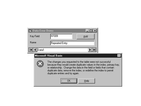 Now save the new form as DATAERR.FRM and the project as DATAERR.VBP. When you run the project, you can test the built-in error trapping for Microsoft data controls by adding a new, duplicate record to the table. Press the Add button, then enter KF109 in the KeyField input box and press one of the arrows on the data control to force it to save the record. You should see a database error message that looks like the one in Figure 14.12.