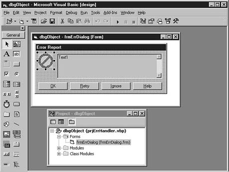 We implement our module trace routines as a new objclass object in the prjErrHandler project. Reload the ActiveX DLL project and add a new class module to the project. Set its Name property to TraceObject and keep its Instancing property set to the default, 5 - MultiUse.