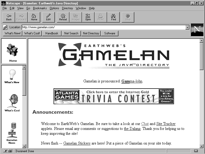 Gamelan is currently the end-all Java resource directory! Besides the official Java Web site at Sun, Gamelan is by far the most useful and comprehensive source of Java information anywhere. It conveniently divides Java up into different categories, with each leading to a wealth of information, source code, and sample applets. Check out Gamelan yourself and you'll see what I mean. It's located at http://www.gamelan.com (see Figure B.2).