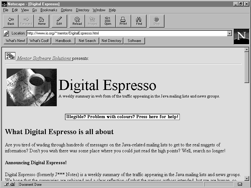 Digital Espresso is an online weekly summary of the traffic appearing in the various Java mailing lists and news groups. Digital Espresso is an excellent Java resource because it pulls information from a variety of sources into a single Web site. It is located at http://www.io.org/~mentor/DigitalEspresso.asp (see Figure B.4).