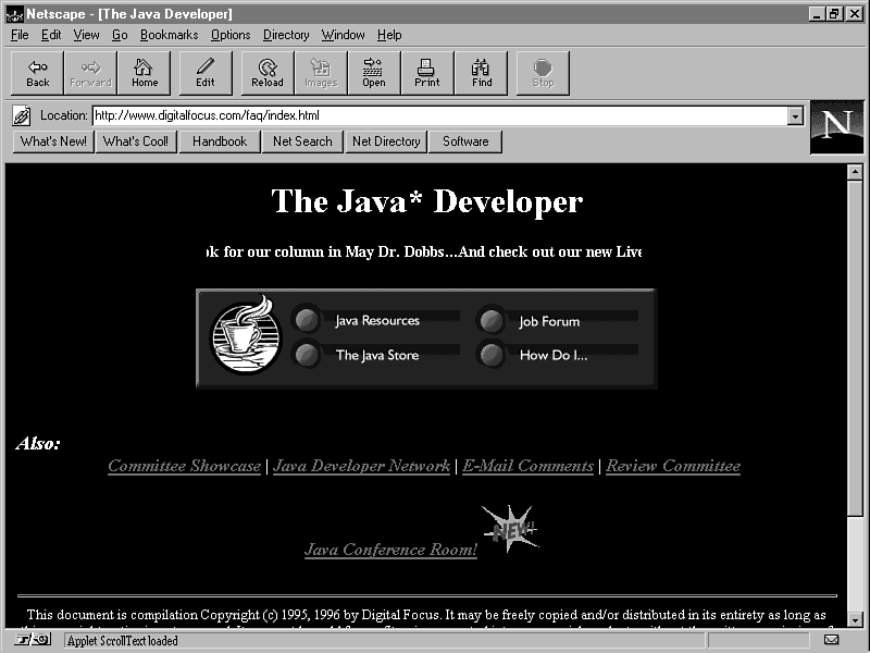 The Java Developer Web site is a very good Web site for sharing information and finding answers to Java programming questions. It has a section called "How Do I " that lists common (and not so common) Java programming questions and their corresponding answers, including example source code. The Java Developer Web site is located at http://www.digitalfocus.com/faq (see Figure B.5).