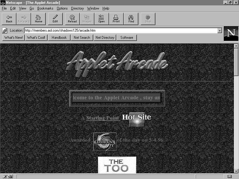 When you want to get some game ideas or just check out what other Java game programmers are up to, head over to the Applet Arcade. The Applet Arcade is a Web site containing links to a wide variety of Java games. The Applet Arcade is located at http://members.aol.com/shadows125/arcade.asp (see Figure B.6).