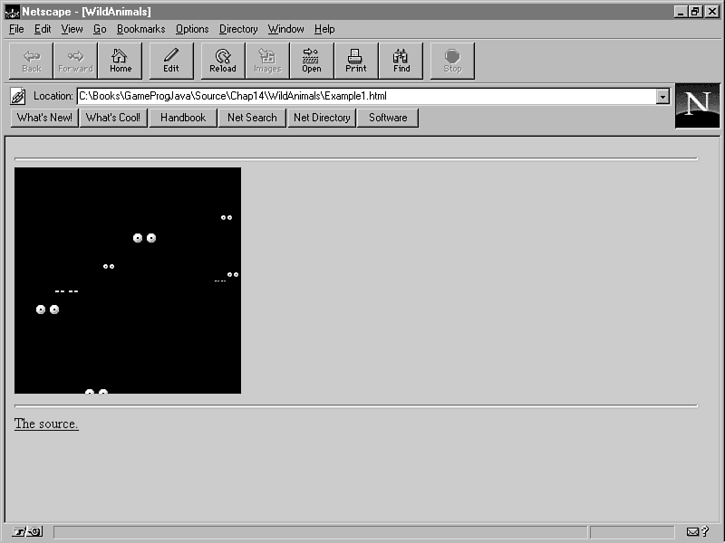 The screen shot of WildAnimals doesn't quite convey the real purpose of the applet. So, at this point, I encourage you to run it for yourself from the CD-ROM to get the real effect. Just in case you're the impatient type and choose to skip the wild animal experience, I'll fill you in on what's happening. WildAnimals randomly plays a variety of wild animal sounds to go with the eyes that are staring at you from the darkness.