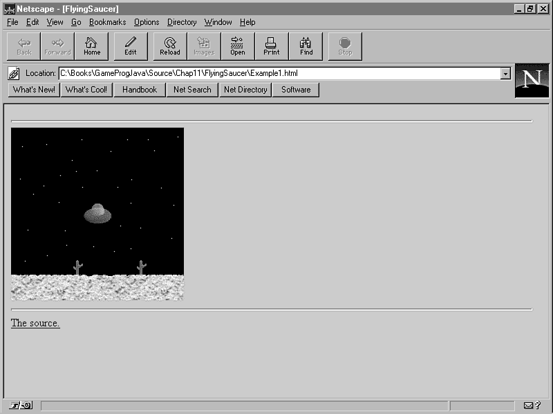 Now that you have a good idea of how to process user input events in Java, let's take a look at a sample applet that uses this newfound knowledge. The Flying Saucer applet uses the sprite classes and event handler methods to implement a user-controllable flying saucer. Figure 9.1 shows what Flying Saucer looks like. The complete source code, executable, and images for the Flying Saucer applet are included on the accompanying CD-ROM.