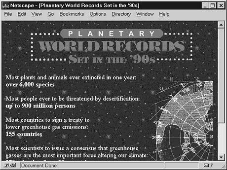 By 1993, almost 100 computers throughout the world were equipped to serve up HTMLpages. Those interlinked pages were dubbed the World Wide Web (WWW), and severalWeb browser programs had been written to allow people to view Web pages. Becauseof the popularity of "the Web," a few programmers soon wrote Web browsersthat could view graphics images along with the text on a Web page. One of these programmerswas Marc Andreessen; he went on to become rich and famous selling the world's mostpopular Web browser, Netscape Navigator. Today, HTML pages are the standard interface to the Internet. They may includeanimated graphics, sound and video, complete interactive programs, and good old-fashionedtext. Millions of Web pages are retrieved each day from thousands of Web server computersaround the world. The Web is on the verge of becoming a mass-market medium, as high-speed Internetconnections through TV cables, modernized phone lines, and direct satellite feedsbecome commonplace. You can already browse the Web using a $300 box attached to yourtelevision instead of using your computer, and the cost of such devices is likelyto fall sharply over the next few years. Yet the Internet is no longer the only place you'll find HTML. Most private corporatenetworks now use HTML to provide business information to employees and clients. HTMLis now the interface of choice for publishing presentations on CD-ROM and the newhigh-capacity digital versatile disk (DVD) format. Microsoft is even integratingHTML directly into the Windows operating system, allowing every storage folder inyour computer to be associated with an HTML page and hypertext links to other foldersand pages. In short, HTML is everywhere. Fortunately, you're in the right place to find outhow HTML Web pages work and how to create them. How Web Pages WorkWhen you are viewing Web pages, they look a lot like paper pages. At first glance,the process of displaying a Web page is simple: You tell your computer which pageyou want to see, and the page appears on your screen. If the page is stored on adisk inside your computer, it appears almost instantly. If it is located on someother computer, you might have to wait for it to be retrieved. Of course, Web pages can do some very convenient things that paper pages can't.For example, you can't point to the words "continued on page 57" in a papermagazine and expect page 57 to automatically appear before your eyes. Nor can youtap your finger on the bottom of a paper order form and expect it to reach the company'sorder fulfillment department five seconds later. You're not likely to see animatedpictures or hear voices talk to you from most paper pages either (newfangled greetingcards aside). All these things are commonplace on Web pages. But there are some deeper differences between Web pages and paper pages that you'llneed to be aware of as a Web page author. For one thing, what appears as a single"page" on your screen may actually be an assembly of elements located inmany different computer files. In fact, it's possible (though uncommon) to createa page that combines text from a computer in Australia with pictures from a computerin Russia and sounds from a computer in Canada. Figure 1.1 shows a typical page as seen by Netscape Navigator, the world's mostpopular software for viewing Web pages. A Web browser such as Netscape Navigatordoes much more than just retrieve a file and put it on the screen; it actually assemblesthe component parts of a page and arranges those parts according to commands hiddenin the text by the author. Those commands are written in HTML.