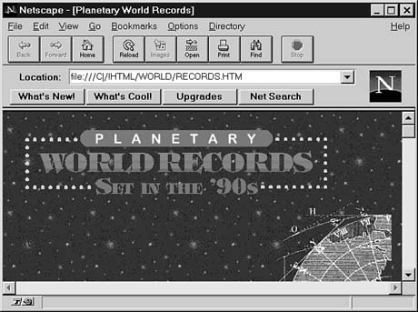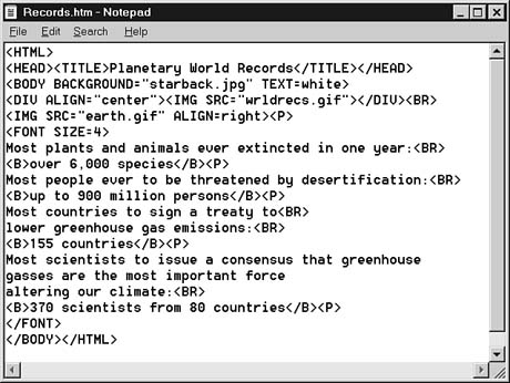 Figure 1.2 shows the text, including the HTML commands I typed to create the pagein Figure 1.1. This text file can be read and edited with any word processor or texteditor. It looks a bit strange with all those odd symbols and code words, but thetext file itself doesn't include any embedded images, boldface text, or other specialformatting. Figure1.1. A Web browser assembles separatetext and image files to display them as an integrated page. All the images and formatting you see in Figure 1.1 are added by Netscape Navigator.It reads the coded HTML commands in the text, which tell it to look for separateimage files and display them along with the text itself. Other commands tell it whichtext to display in boldface and how to break up the lines of text on the page. Figure1.2. This is the text I typed to createthe page in Figure 1.1. The words between < and > are HTMLtags.